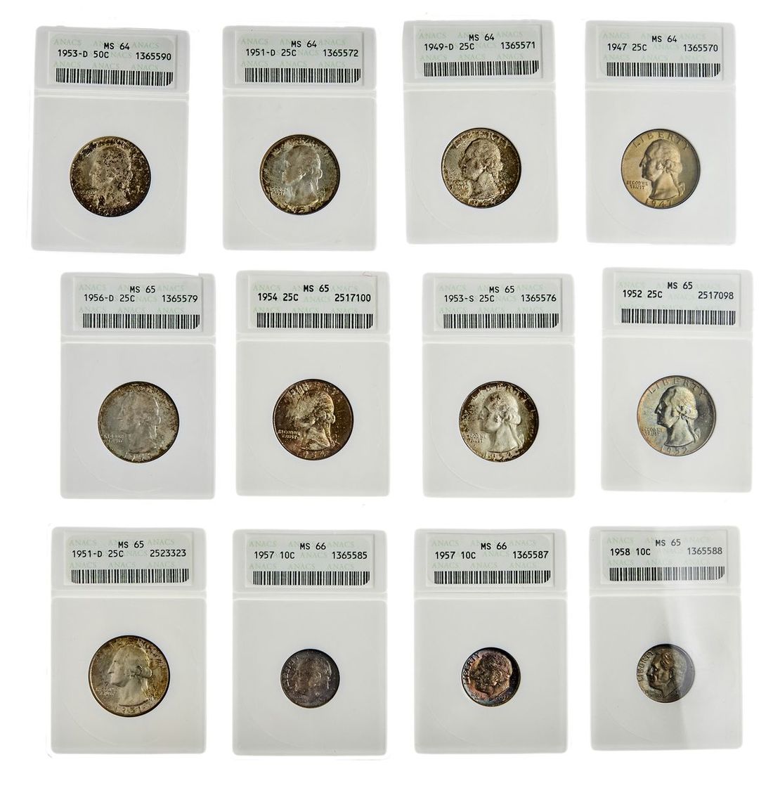 Lot of High-grade Encapsulated Roosevelt Dimes and Washington Quarters. MS Dimes all in ANACS holders - 1949, 1955, 1957 (2). MS 66; 1952. MS 64; 1958. MS 65; Proof Dimes all in NGC holders - 1961. PF 68 Cameo; 1962. PF 67 Ultra Cameo; 1963, 1964. PF 68 Ultra Cameo; 1964. PF 69; MS Quarters all in ANACS holders - 1947, 1949-D, 1951-D, 1953-D. MS 64; 1951-D, 1952, 1953-S, 1954, 1956-D. MS 65. (20)