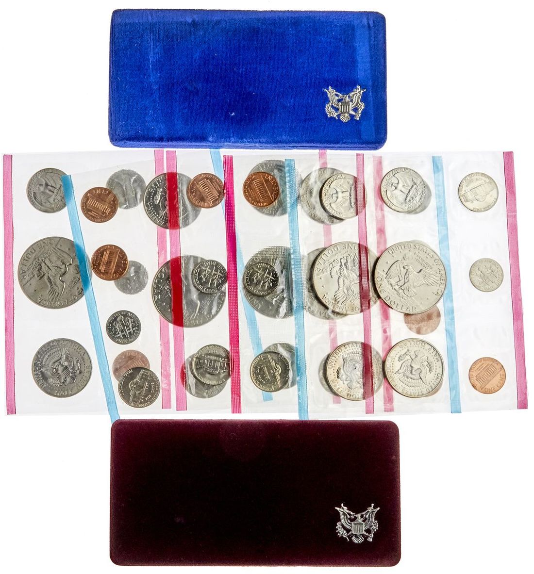 Assortment of modern Commemoratives, Proof and Mint Sets and Singles. Commemoratives: Proof Dollars - 1988 Olympics, 1990 Eisenhower Centennial; 1982 Proof Washington Half Dollar;  Olympic 1983 and 1984 Proof Dollar set; 1986 Statue of Liberty Half Dollar and Dollar Proof set; Proof sets - 1970, 1971 (3), 1972 (3), 1973, 1974, 1975 (2), 1976, 1978 (3), 1979 (3), 1980, 1981, 1982, 1984 (2), 1985 (2), 1986, 1989, 1993; 1984 Prestige Proof set;1993 Premier Proof set; Mint sets. 1968, 1973 (6); and Uncirculated Eisenhower Silver Dollars 1972, 1973 (2).