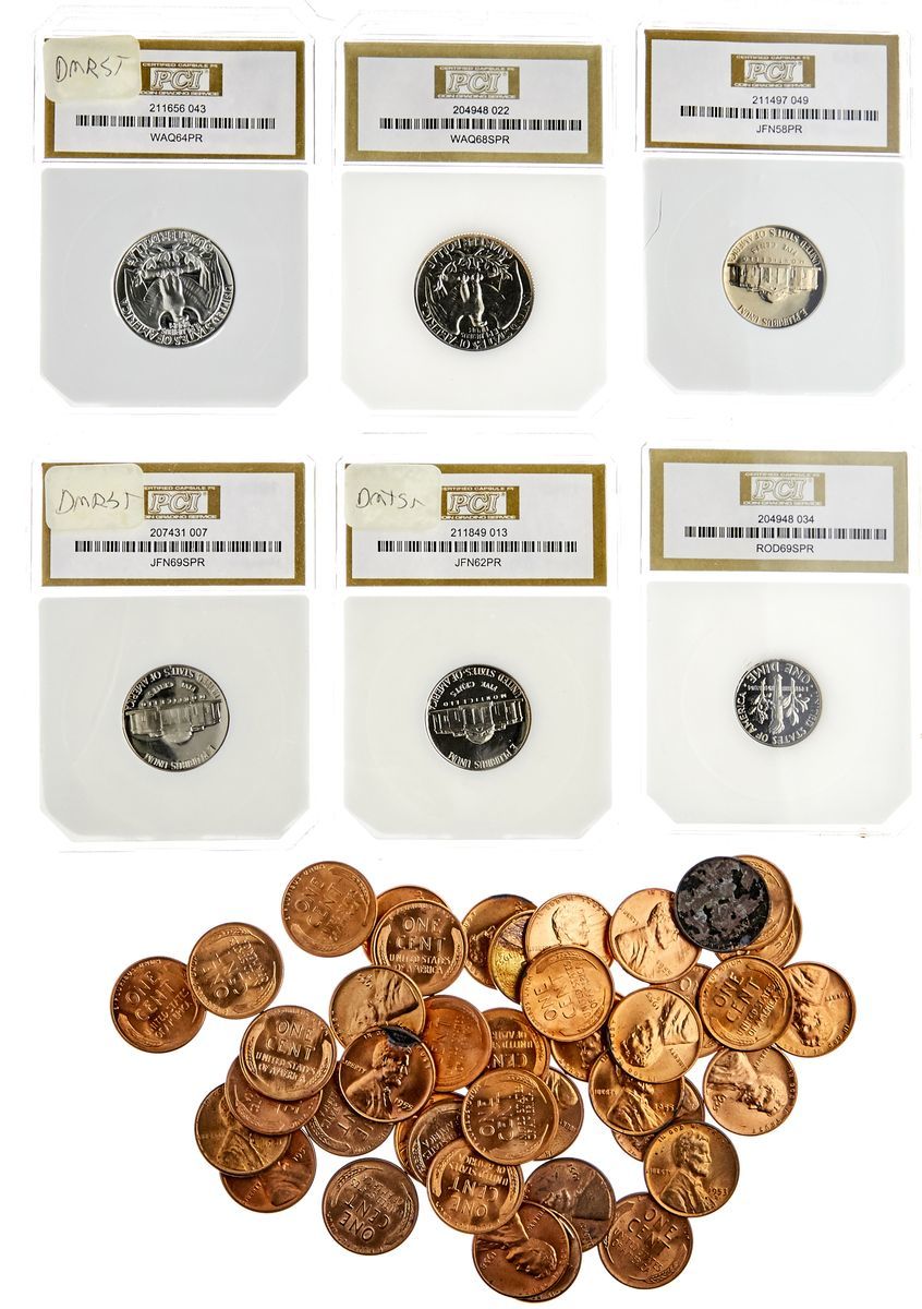 Proof and MS Modern Singles and rolls. Encapsulated. Lincoln Cents: Proof - 1960 (3). NGC PF 69 RD, PCI PR 69 Deep Cameo and PR67 Cam; 1963. PCGS PR68RD CAM; 1964. PCS PR 69 Deep Cameo; 1968-S (2). PCGS PR66RD CAM, PCI PR69 Deep Cameo; 1969-S. PCI PR 69 Deep Cameo; MS - 1955-S. NGC MS 66 RD; 1958, 1958-D. Both ANACS MS 65 Red; Jefferson Nickels: Proof - 1958, 1962, 1969-S. PCI PR68 Deep Cameo; Roosevelt Dimes. 1969-S. PCI PR69 Deep Cameo; Washington Quarters - 1960, 1962. PCI PR68 Deep Cameo; 1964. 1968-S. PCI PR69 Deep Cameo; and 'Raw' Proof Lincoln Cents - 1957, 1961, 1963, 1964, 1968-S (2), 1969-S (2), 1971-S, 1972-S (3), 1973-S (2), 1974-S (2), Proof Nickel: 1963; Roll of Unc. 1951-1958 Lincoln Cents and roll of 1953-D AU-Unc Lincoln Cents; also JFK Half Dollars: 1976 Bicentennial (20), 1979-S (20). Brilliant Proof.