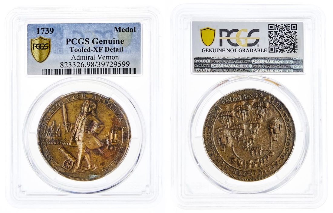 1739 Admiral Vernon, Havana. Medal. Betts 314. Admiral Vernon standing ¾ left, sword raised, saucer-eyed, by cannon, Havana and ship in background, rev. Six ships entering harbor; HE.TOOK.PORTO.BELLO.WITH.SIX.SHIPS.ONLY, date in ex. PCGS Genuine - Tooled-XF Detail.