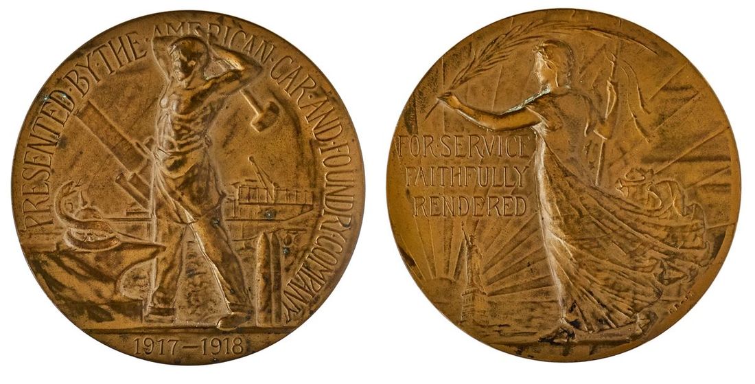 American Car and Foundry Company Medal, 1917-1918. Bronze, 63.5mm. By Chester A. Beach and Julio Kilenyi. Gorham Co. Worker about to strike snake coiled on anvil with a sledge hammer, mobile gun on chassis in background, rev. Columbia walking left, holding palm frond, Statue of Liberty and sun in distance. Presented to the company's employees for their work on WWI munitions contracts and their help "in the winning of the Great War". Marqusee 52. Scarce medal. In original case (some scuffs) with card from Company President William H. Woodin. Extremely Fine.