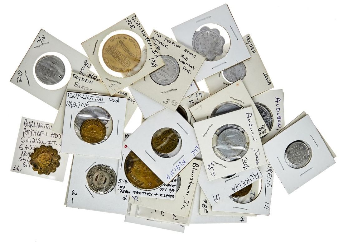 Iowa. Collection of Trade Tokens: Ackley to Des Moines. Includes issues of Ackley, Akron, Albia, Alta Vista, Alton, Anita, Anthon, Arthur, Aspinwall, Atlantic, Auburn, Audubon, Aurelia, Bagley, Beaver, Belle Plaine, Bidwell, Blairstown, Blencoe, Boone, Boyden, Breda, Burlington, Burt, Buttenberg, Calmar, Calumet, Carpenter, Carroll, Cascade, Castana, Cedar Falls, Cedar Rapids, Centerville, Charter Oak, Cherokee, Churdan, Clayton Center, Clear Lake, Clinton, Coon Rapids, Craig, Creston, Cushing, Danbury, Davenport, Denver and Des Moines . Generally Aluminum and Brass; a few fiber, cardboard, one or two plastic. Mostly, if not all, different. Also a few dog licenses, transportation tokens and one or two Masonic Chapter Pennies. Some scarcer issues. About Fine-Uncirculated. (159)