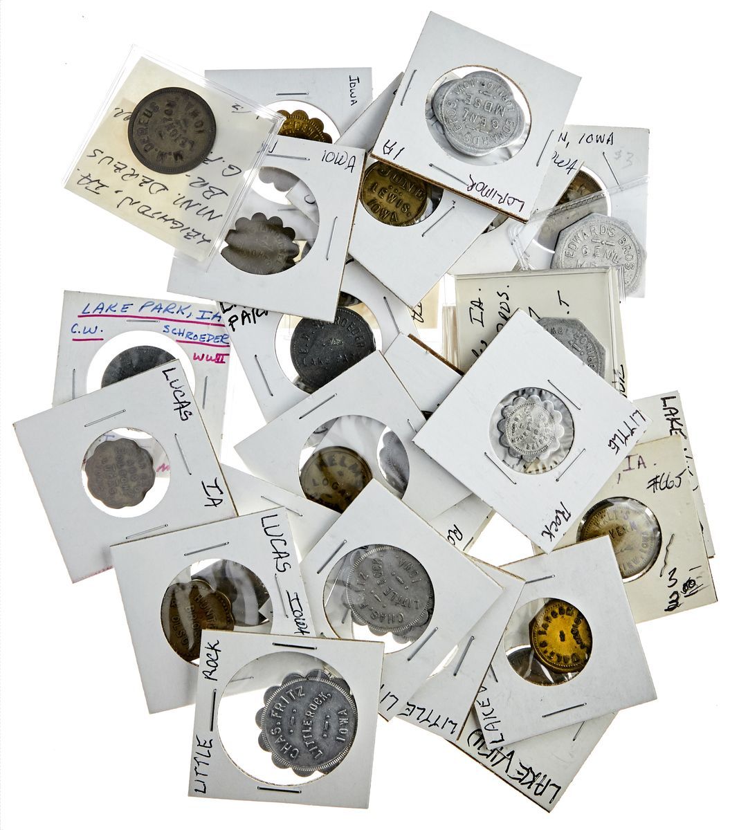 Iowa. Collection of Trade Tokens: Dubuque to Murray. Includes issues of Dubuque, Dumont, Dunlap, Durant, Dyersville, Dysart, Eagle Grove, Earling, Eddyville, Eldon, Eldora, Elgin, Essex, Exira, Fairfield, Farrar, Fertile, Fonda, Fort Dodge, Griswold, Inwood, Keokuk, Keystone, Kimballton, Lake Park, Lake View, La Porte City, Larchwood, Lawton, Leighton, Le Mars, Lester, Lewis, Lidderdale, Little Rock, Logan, Lorimor, Lowden, Lucas, Luzerne, Manchester, Manning, Mapleton, Marshalltown, Mason City, Maxwell, Milford, Minburn, Moorhead, Monona, Mt. Sterling, Moville, and Murray. In Aluminum, Brass, Zinc, Fiber, Hard Rubber or Bakelite. Mostly, if not all, different. Some scarce. Fine-Uncirculated. (184)