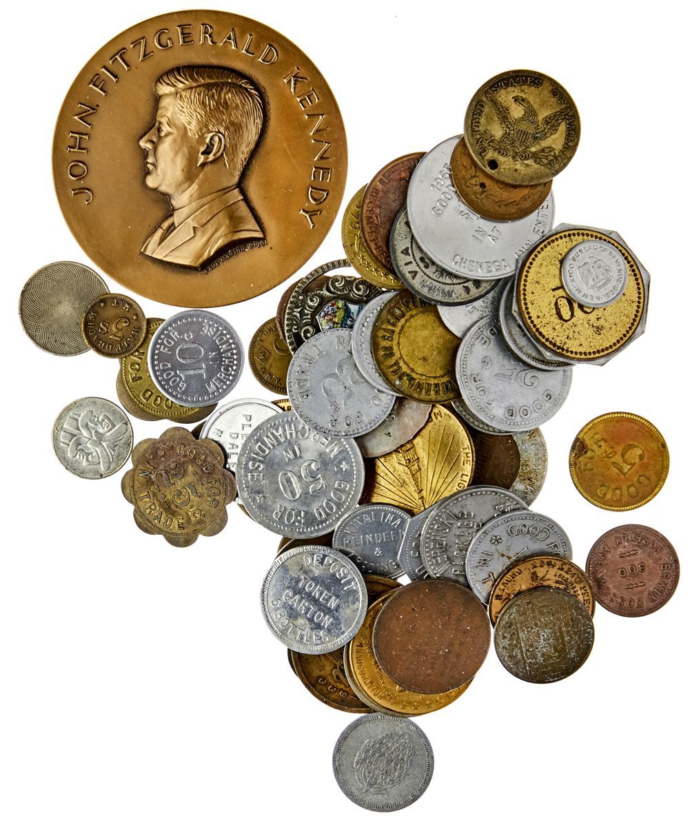 Assortment of US Exonumia and other Includes Good For Tokens (25) -- --NY, CT, Ma, Alaska, Nebraska, and elsewhere; a JFK Bronze Inaugural medal; Contribution Token 1933 St Peters College, Jersey City; Knights Templar Commandery of Philadelphia 1883 Pilgrimage to San Francisco gilt bronze medal; Sterling NY World Telegram 1931 Bowling Tournament badge; Sterling US Steel 45 Years of service medal; a Civil War token, a few 19th Century tokens, miscellaneous other medallets, badges, apothecary weights, etc.; a small Spanish 1892 Columbus medal; and a few world tokens - Italy (2), Bohemia; a Canadian medal, Love token engraved on a Canadian Victoria Half Dollar, and a German fob. One holed. Fine-EF. (70)