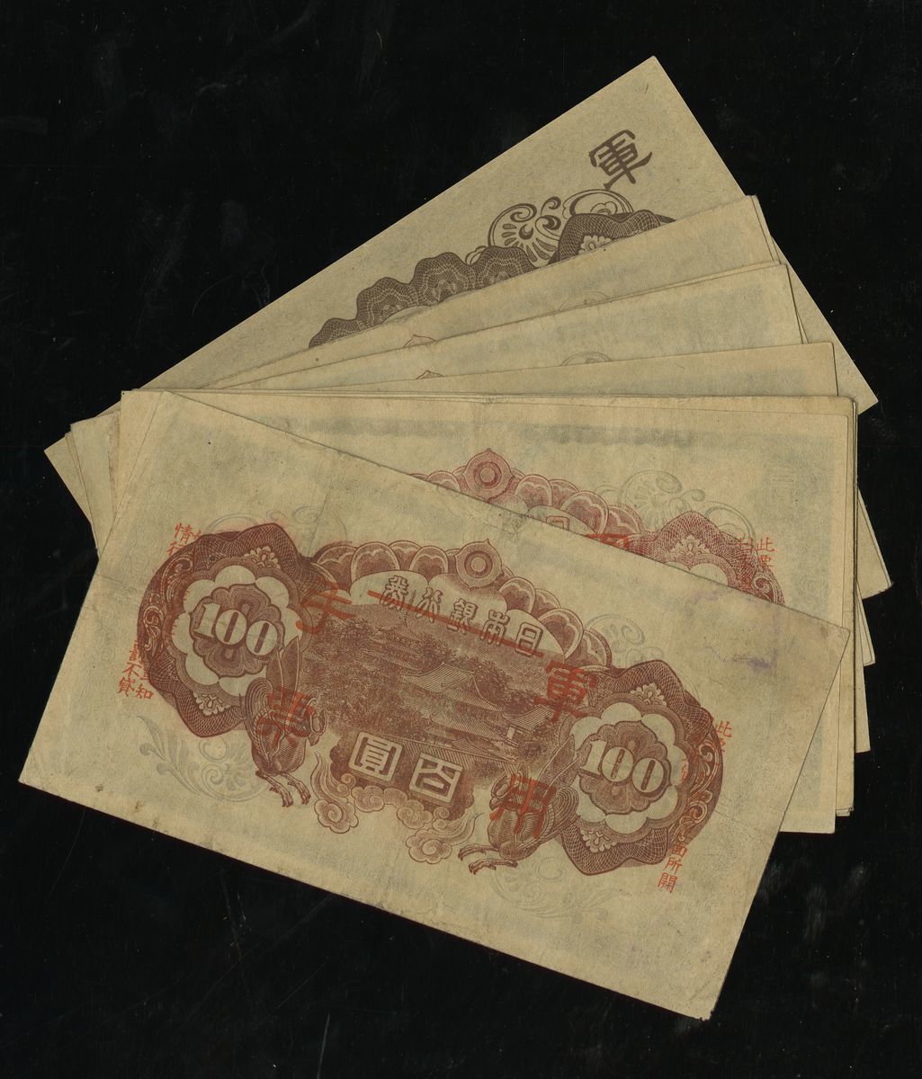 China. WWII Japanese Military. 1945 Hong Kong Notes. 100 Yen (18). P-M28 (17), M29. Black on light blue and brown; Black on green and lilac Shotoku-taishi portrait at right, Yumidono pavilion at left. Overprint - 4 Japanese characters in red across center, 7 characters below, overprint on back; the 7 characters in black above, no overprint on back. Some with edge nicks. The P-M28 Very Fine, the P-M29 Uncirculated. [18]