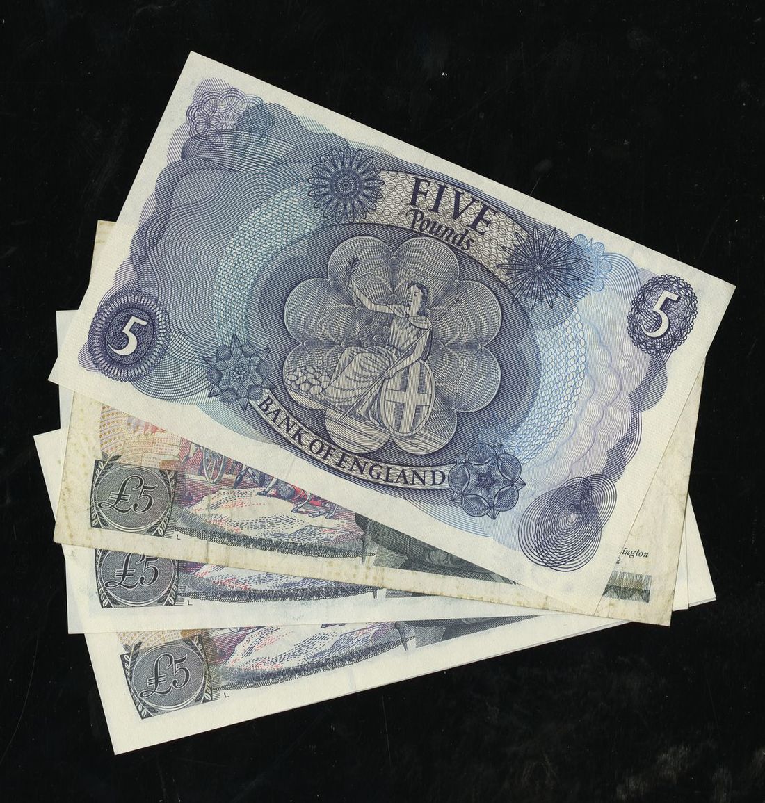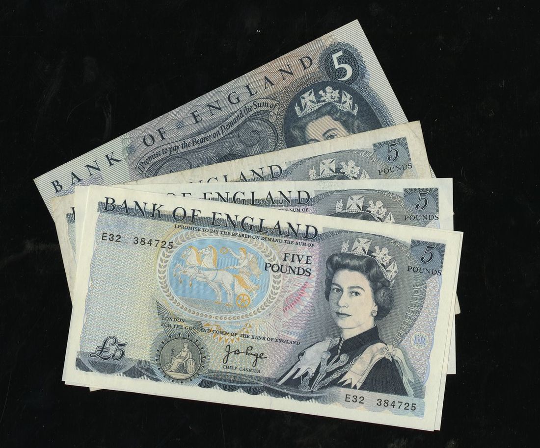 Great Britain. Bank of England. Group of 1966-1991 5 Pounds. ND (1966-70). P-375b. Signed J.S. Fforde; P-378b, c (2), f. Signed: J.B. Page in black (1973-80), D.H.F. Somerset (1980-87), G.M. Gill (1988-91). The Somerset VF and EF; the others Uncirculated. [5]