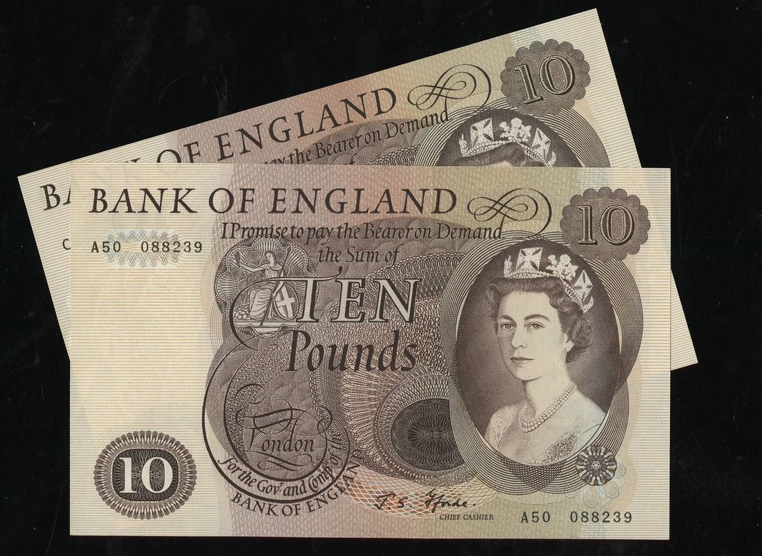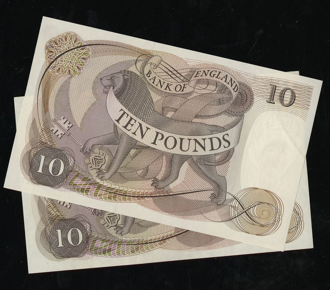 Great Britain. Bank of England. Pair of 10 Pounds. ND (1964-1975). P-376b, c. Signed: J.S. Fforde (1966-70), and J.B. Page (1970-75). Queen Elizabeth II portrait at right, Lion on back. EF-AU. [2]
