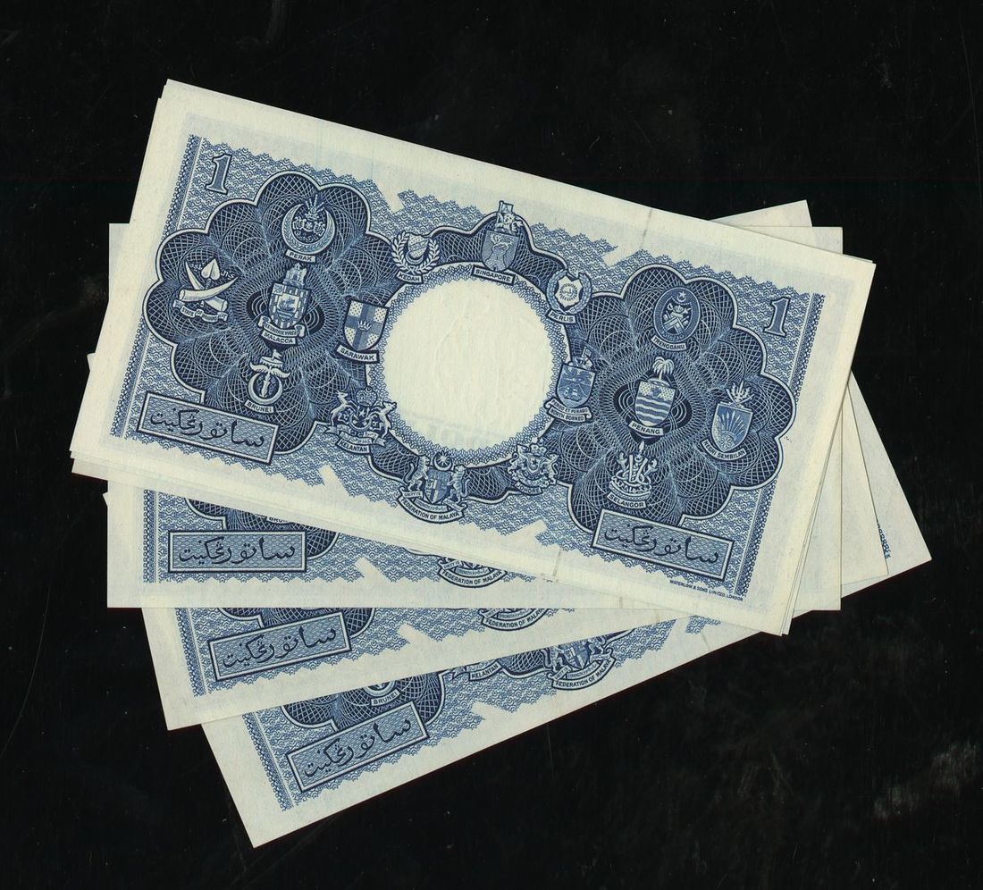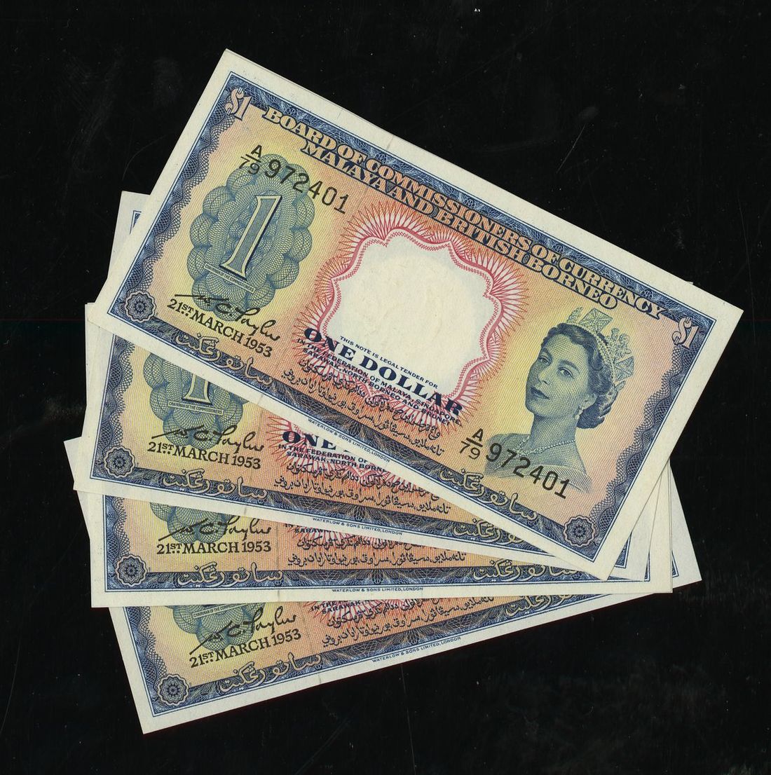 Malaya and British Borneo. Board of Commissioners of Currency. Group of Sequentially Numbered 1 Dollar Bills. 1953. P-1a (6). No. A/79 972401 to A/79 972406. Queen Elizabeth II bust at right. Uncirculated. [6]