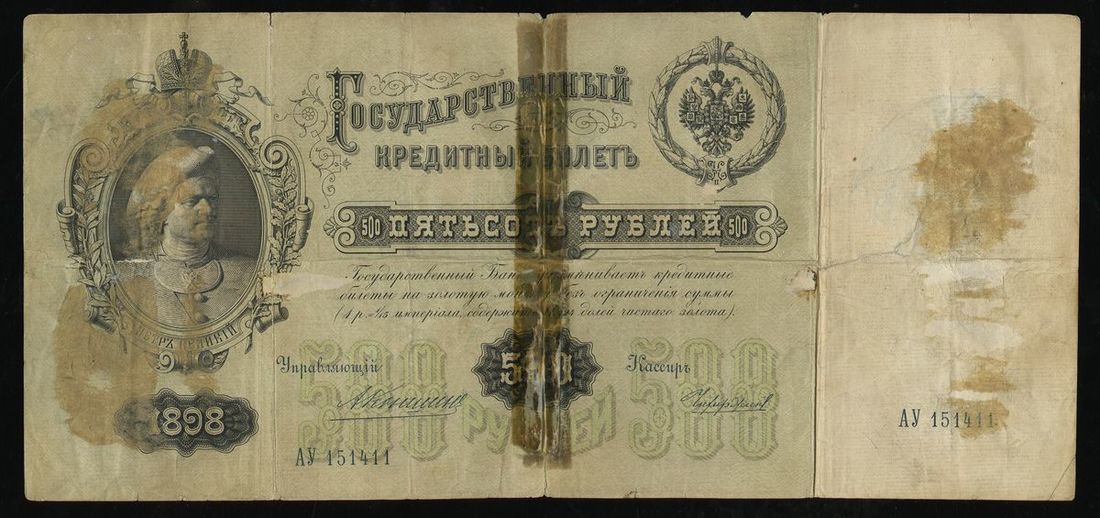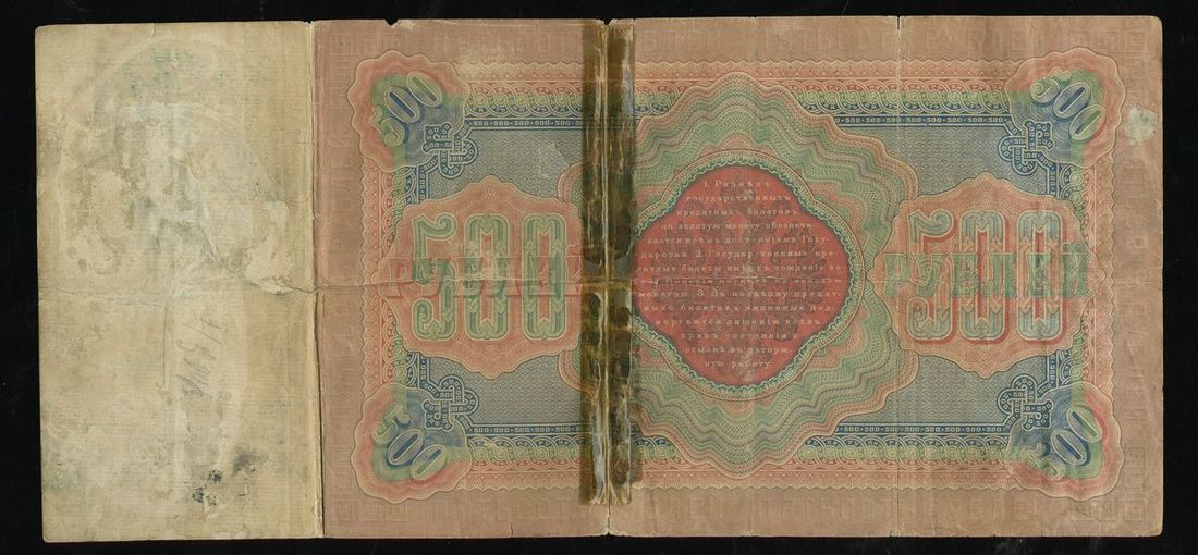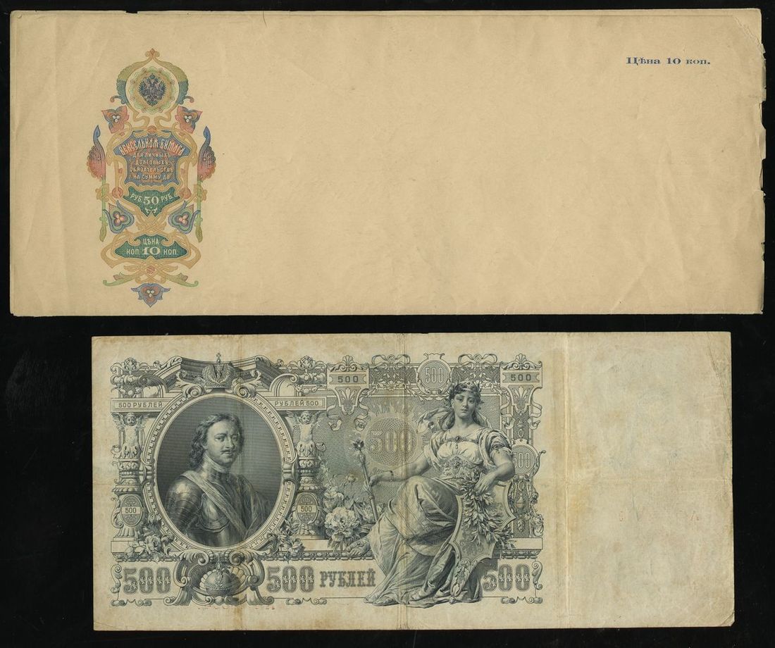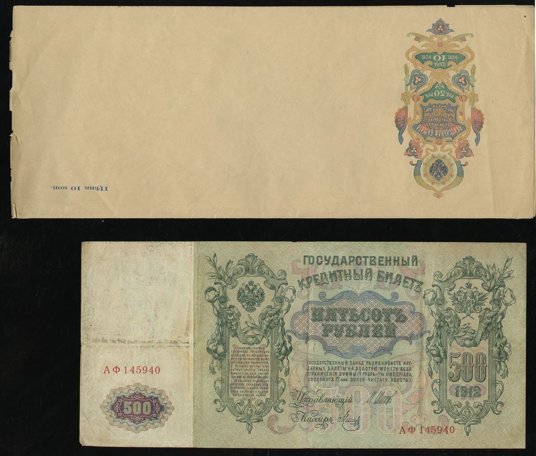Russia. Imperial Proof Sheet of four ca. 1914 Promissory Note Issue 50 Rubles. Multicolor cartouches at left, and printed surcharge of 10 Kopeks upper right only on each note; watermarked sheet. Some nicks, nibbles along right edge, VF-EF; also 1898 500 Rubles. P-6c. Mount stains, old taping along central split, Fine details; and 1912 500 Rubles, P-14b. F-VF.