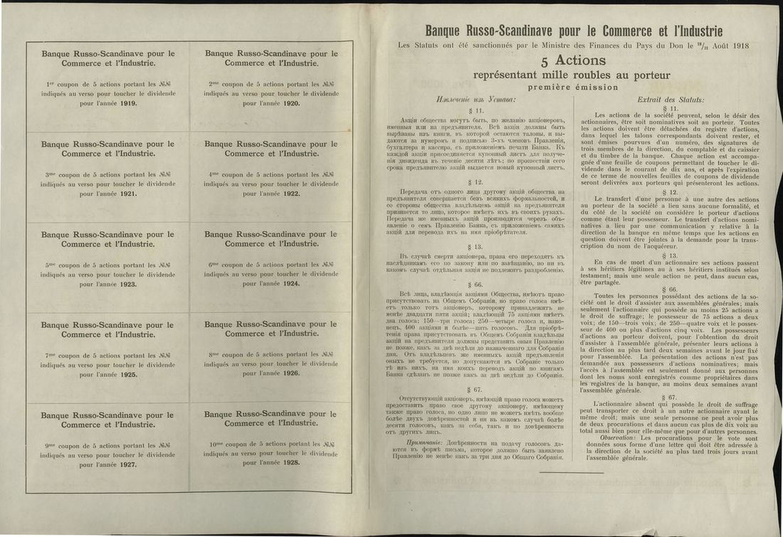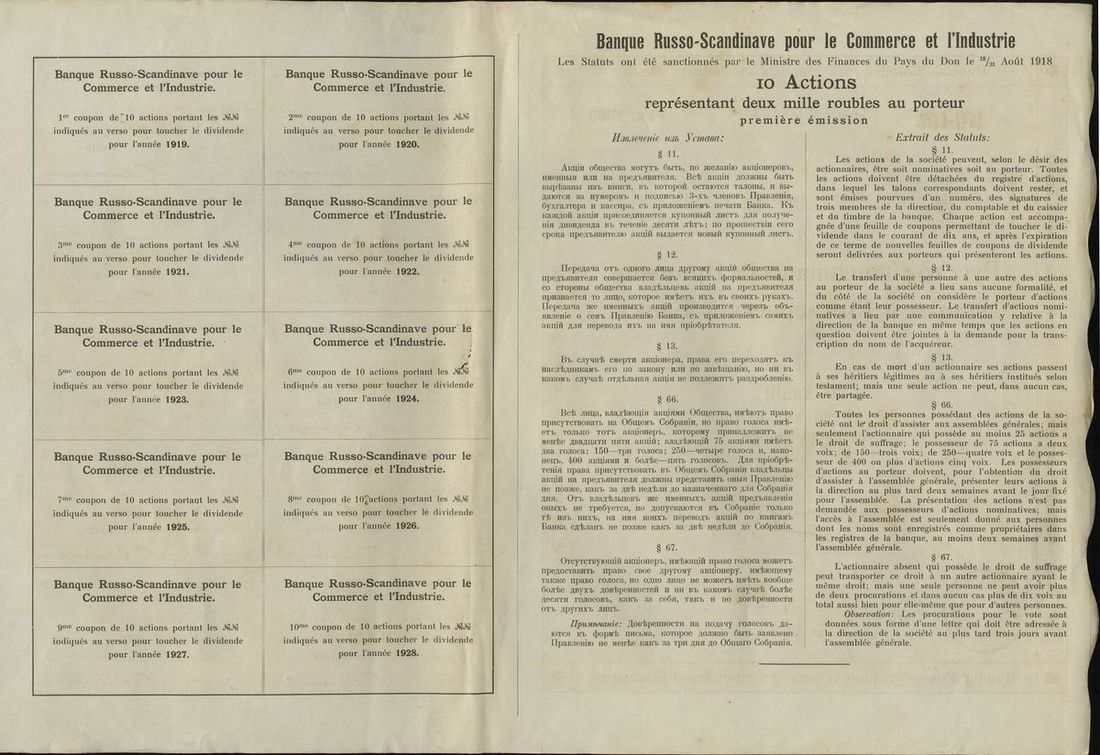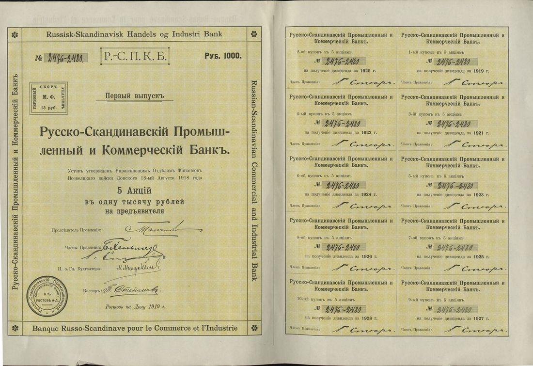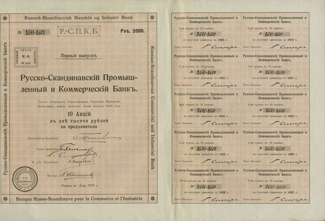 Russia. Russisk-Skandinavisk Handels og Industri Bank (Banque Russo-Scandinave pour le Commerce et l'Industrie). Pair of Bonds. 1,000 and 2,000 Rubles. Rostov-on-Don 1919. With complete coupons. Rare. Small nick bottom edge of the first. Extremely Fine [2]