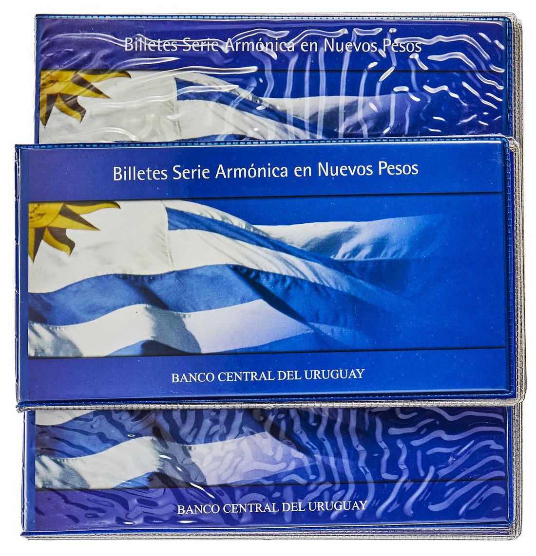 Uruguay. Banco Central. Three Museo Numismático-Banco Central wallets with the 1989-1992 Notes - issued notes and unissued specimens. "Billete Serie Armónica en Nuevos Pesos". Each album contains the 2,000, 20,000, 50,000, 100,000, 200,000 and 500,000 Nuevos Pesos. P-68-73a; and the Specimen - "No Emitidos" 1,000, 5,000, and 10,000 Nuevos Pesos. P-67A, 68A, 69B. All clip cancelled at top bottom, left and right margins. Crisp Uncirculated.