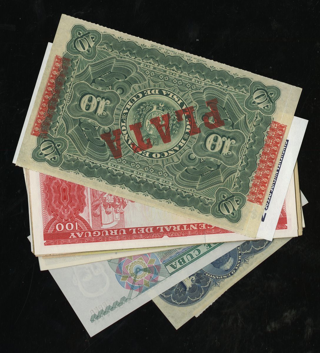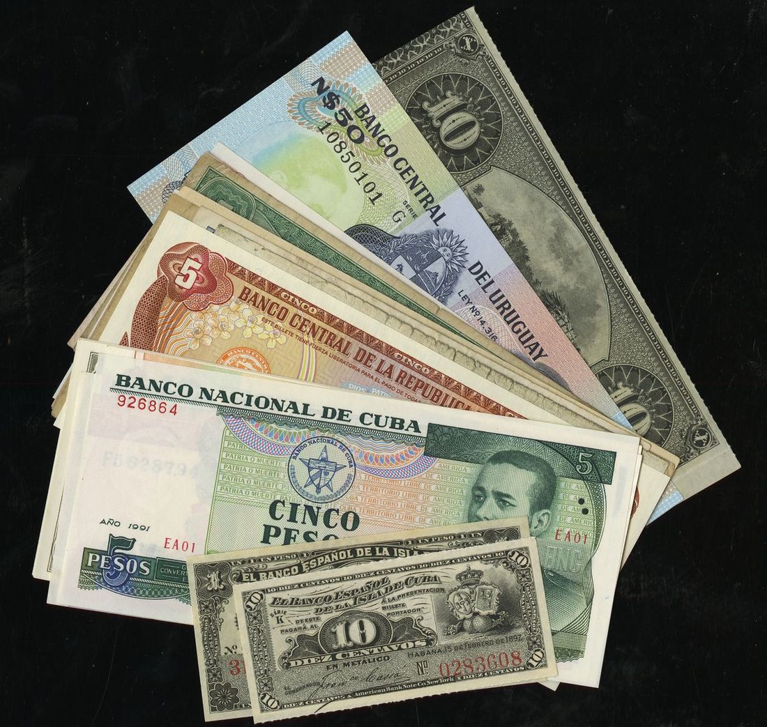 Latin America and Caribbean Grouping. Includes: Barbados. P-29, 68b; Brazil. P-176 (4); Colombia. P-404a, 405; Cuba. P-47, 49, 52, P-108; Dominican Republic. P-118c; Jamaica. P-69d; Mexico. 50 Centavos, Monterrey 1914; 5 Pesos, Oaxaca de Jerez 1916 (pinholes); Trinidad and Tobago. P-30b (3), 31a, 39a; and Uruguay. 100 Pesos (1967), 50 Nuevos Pesos (1975-88). The Colombia, Mexico and Trinidad and Tobago. F-VF, the rest generally EF-Unc. [23]
