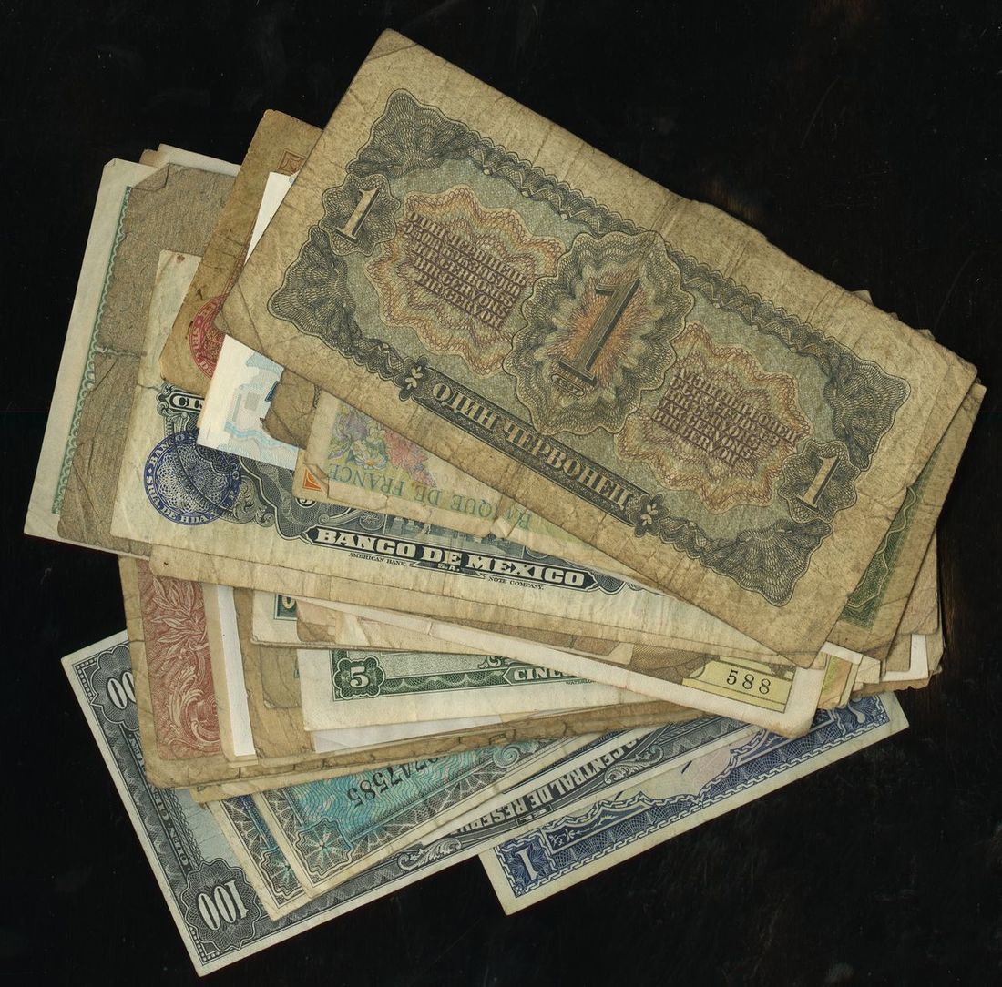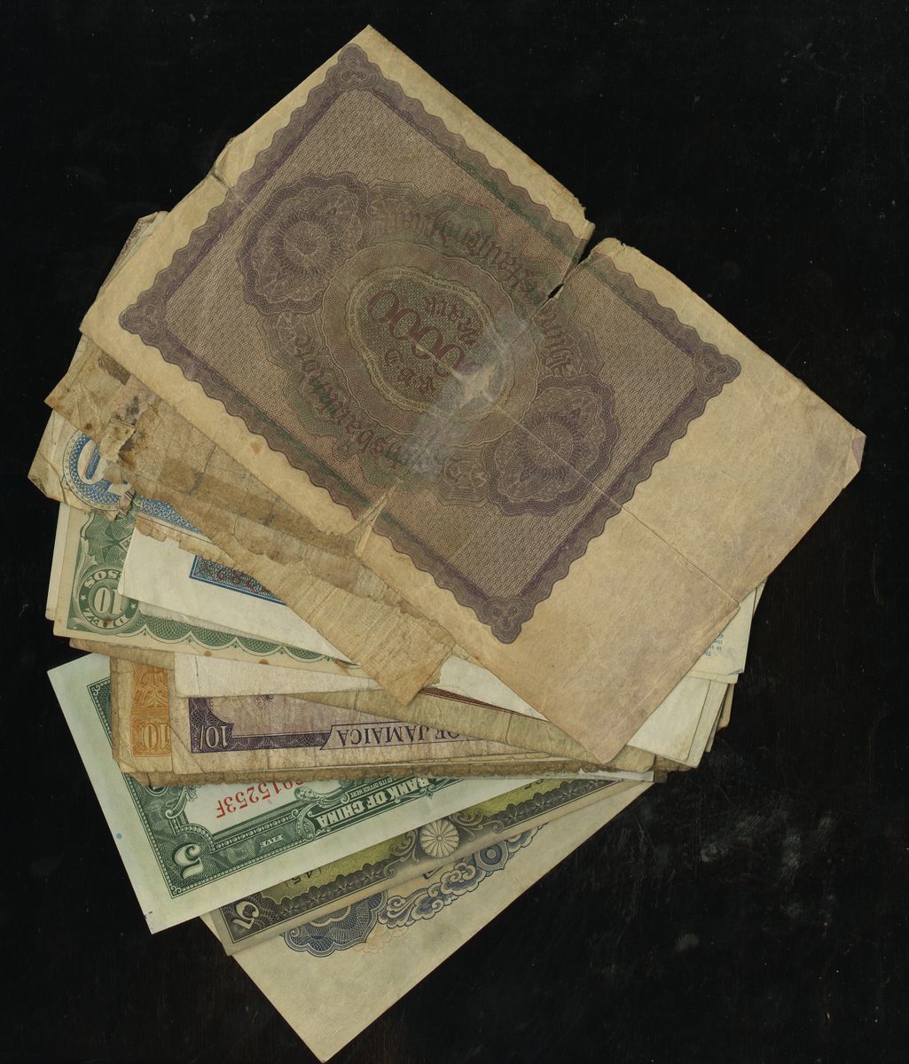 World Paper Money Assortment. Generally 1908-1960. Includes issues of Greece, USSR (1921-1938), France, Germany, Mexico, Netherlands, Dutch East Indies, Brazil, Chile, Peru, Luxembourg, Algeria, Japanese Occupation notes, British India, China, and others; also a few with typed WWII messages - "A Merry Christmas and a Happy New Year from CBI Land 1944" on Chinese 1 and 5 Yuan; "Iwo Jima March 14-20 '45" on Japanese 5 Yen, and "Gunshu, Shikoku Is., Japan October 24th, 1945" on Japanese 10 Yen. A few damaged, otherwise Good to AU; also Irish Hospital Sweepstakes coupons (3); and damaged and Poor-Fair CSA (3) and obsolete (2) notes. [122]