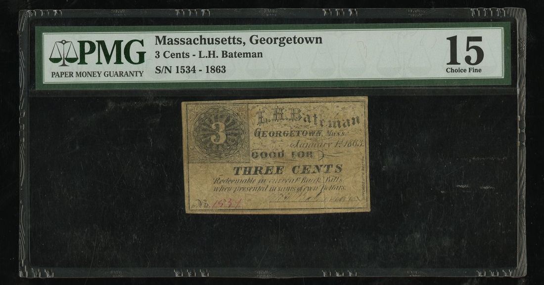 Massachusetts. Georgetown. L.H. Bateman. 3 Cents Scrip. January 1, 1863. PMG Choice Fine 15.