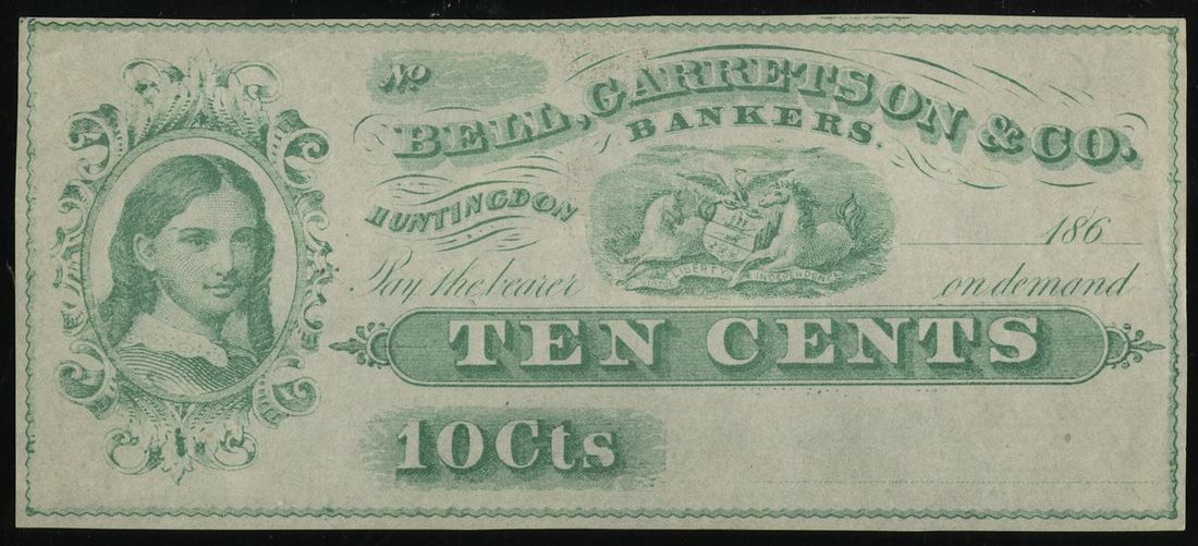 Pennsylvania. Huntingdon. Bell, Carretson & Co. 10 Cents. 186x. Portrait of a young girl at left, State Arms center. Unissued remainder. Uncirculated.
