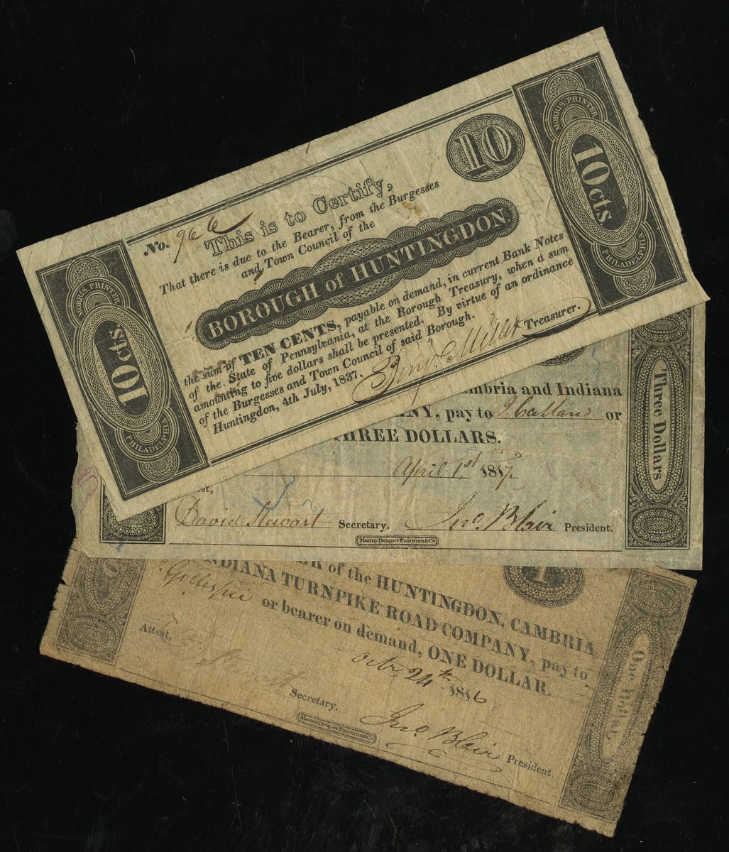 Pennsylvania. Huntingdon. Trio: Huntingdon, Cambria and Indiana Turnpike Road Co. pair. $1. Ocr. 24, 1816; and $3. April 1, 1817. VG and Fine; and Borough of Huntingdon. 10 Cents. 4th July 1837. Fine. [3]