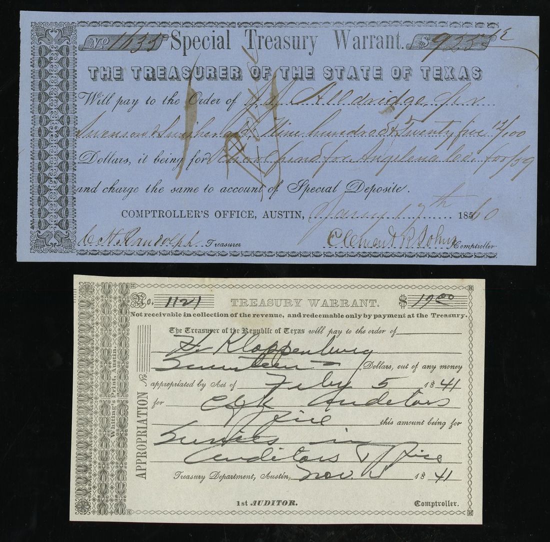 Texas. Pair of Treasury Warrants. Republic. $17. Austin, Nov. 21, 1841; and State. $925.12. Austin, Jan, 17, 1860. TW-68. Angelina County. AU-Uncirculated. [2]