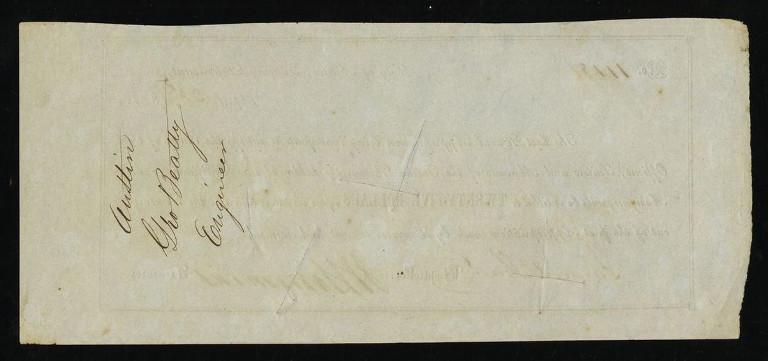 Texas. Republic of Texas. City of Austin, Treasury Dept. $25 Naval Appropriation Certificate. Fifth Issue of Warrants. April 23, 1841. Medlar 44. Used for the second Texan Navy after the first had lost all four of its vessels to war and the forces of Nature. Endorsed by Engineer George Beatty on verso. Large margins. Cut cancelled. EF-AU. Ex Heritage/CAA Sale, Long Beach Ca, 2006, lot 12244.