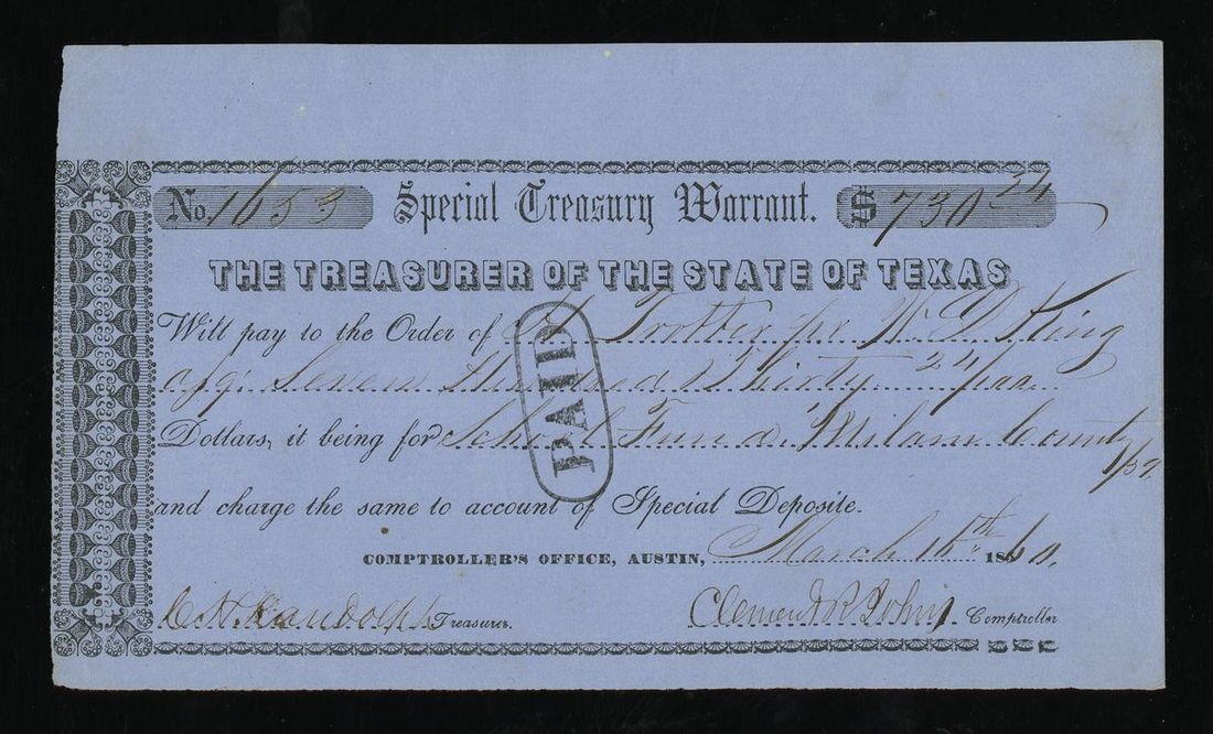 Texas. State of Texas. Special Treasury Warrant. $730. March 15, 1860. TW-68. Milam County. Uncirculated.