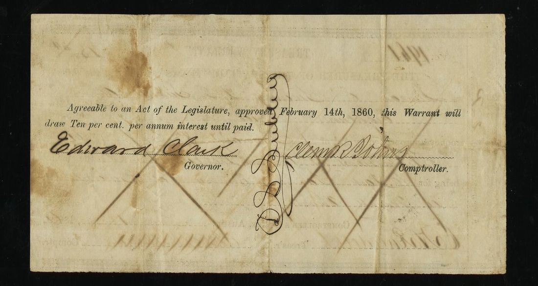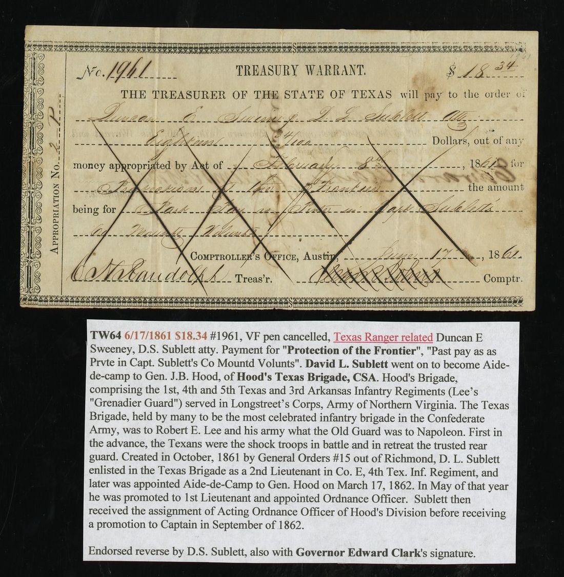 Texas. Civil War. Treasury Warrant. "Protection of the Frontier". $18.34. June 17, 1861. To Duncan E. Sweeney, serving inCapt. Sublett's Company of Mounted Volunteers. Endorsed on verso by D.S. Sublett and Governor Edward Clark. Pen cancelled. Very Fine.