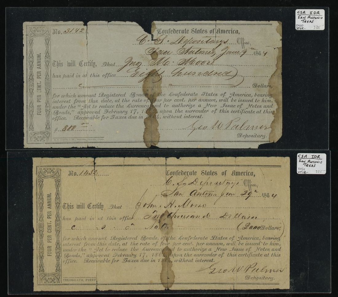 Texas. CSA. Pair of Interim Depository Receipts. $800. San Antonio, June 9, 1864. No. 3142; and $2,000. San Antonio, June 29, 1864. No. 1432. Very Rare. Both with horizontal ink blot stain at center, long trifold horizontal splits and edge chipping. Very Good. [2]