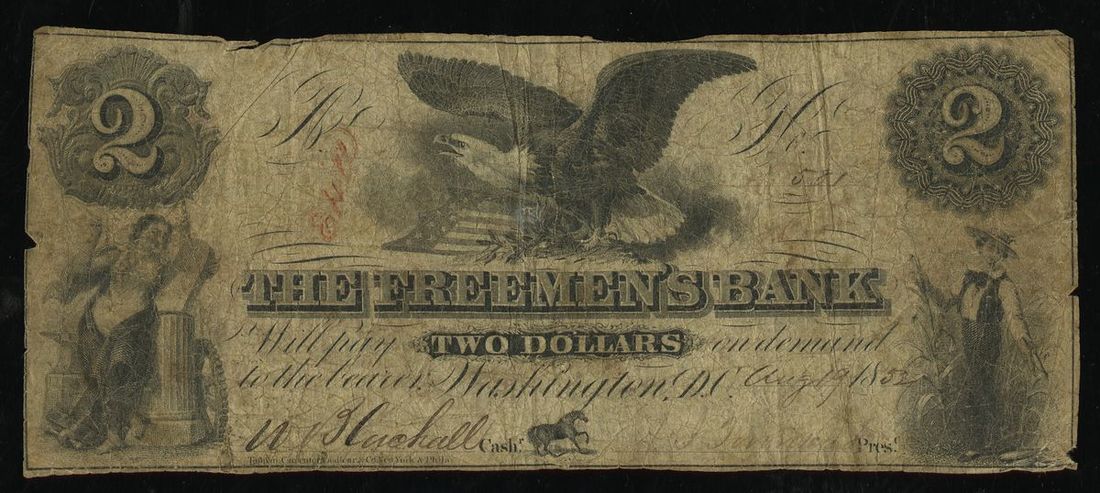 Washington, D.C. Freemen's Bank. $2. August 19, 1852. DC-245 G-4. Eagle and shield upper center, Muse and column lower left, farm boy lower right. Red ink signature in field. Some nibbling at edges. Very Good.