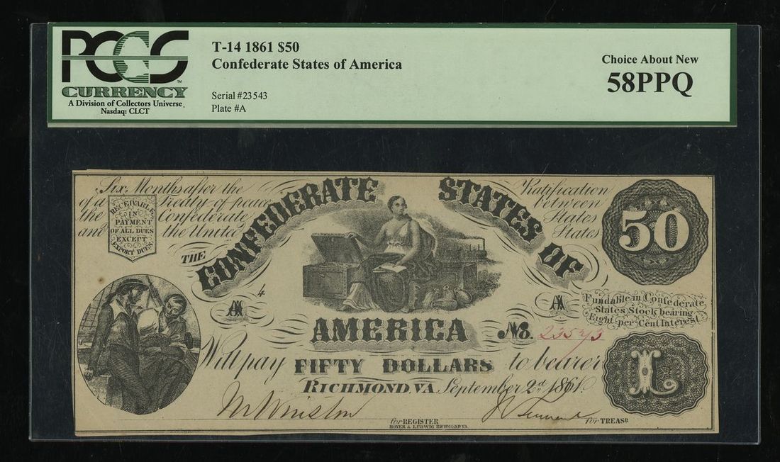 CSA. T-14. $50. 1861. No. 23573. Moneta with money chest. PCGS Choice About New 58 PPQ.