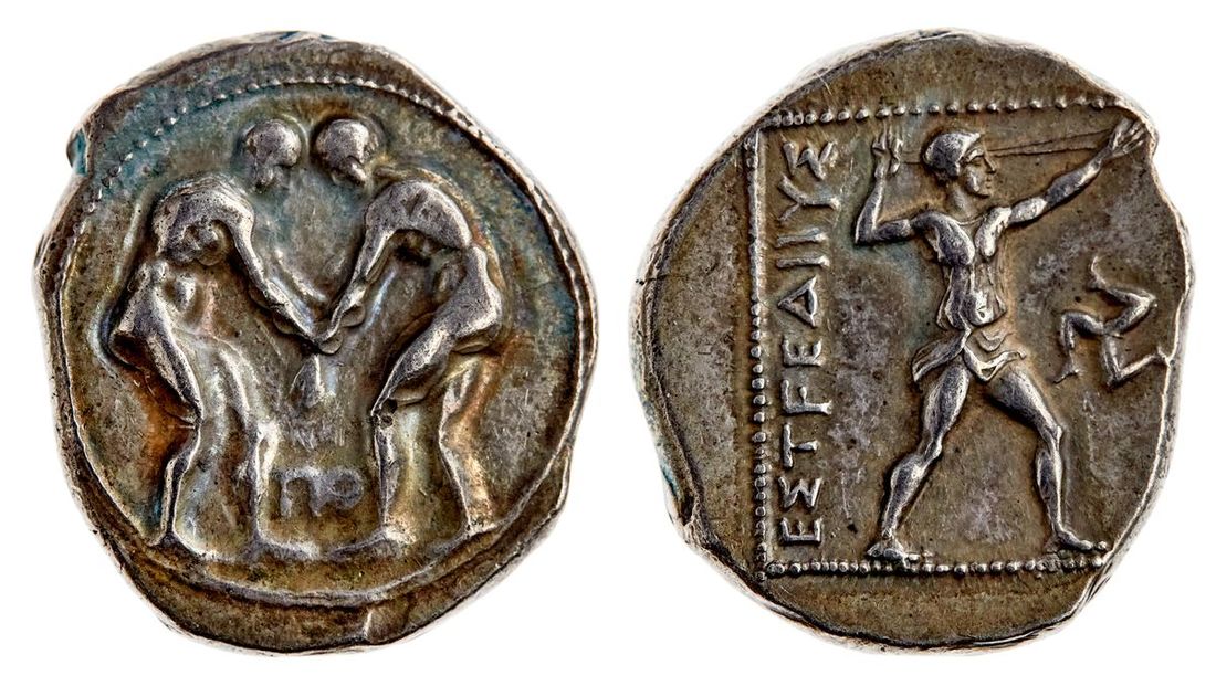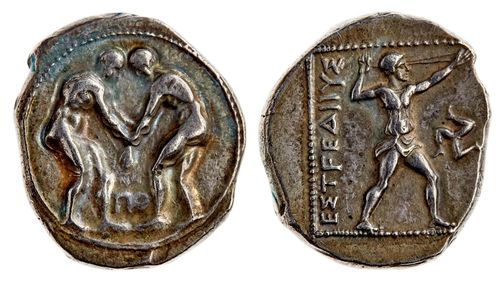 Pamphylia. Aspendos. AR Stater, ca. 330/25-300/250 BC. 10.8 gms. Two wrestlers grappling, ?O between, below, rev. Slinger standing right, triskeles before, all within beaded square. Cf.Tekin Series 5 (with K monogram between slinger's legs). Toned. Good Very Fine.