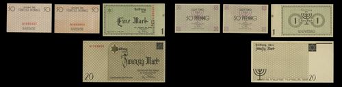 Poland. Litzmannstadt (Lodz) Ghetto. Quartet of Quittungen, May 15, 1940. 50 Pfennig (2), 1 Mark and 20 Mark (without watermark). Jewish star in circle upper left. S/B 1001, 1002, 1006. The 1 mark small stain in margin. Uncirculated. [4]