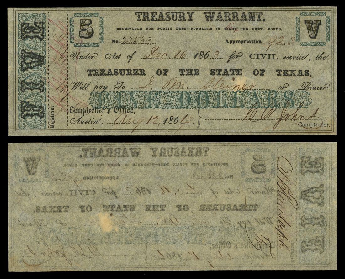 Texas. Treasury Warrant, $5, Act of 1863 (Aug 12, 1864). TW 14c, Cr.14a. Civil Service. No. 22533. Blue-green highlights. "Dues" above misspelled as "Deus". Rare. Uncirculated.