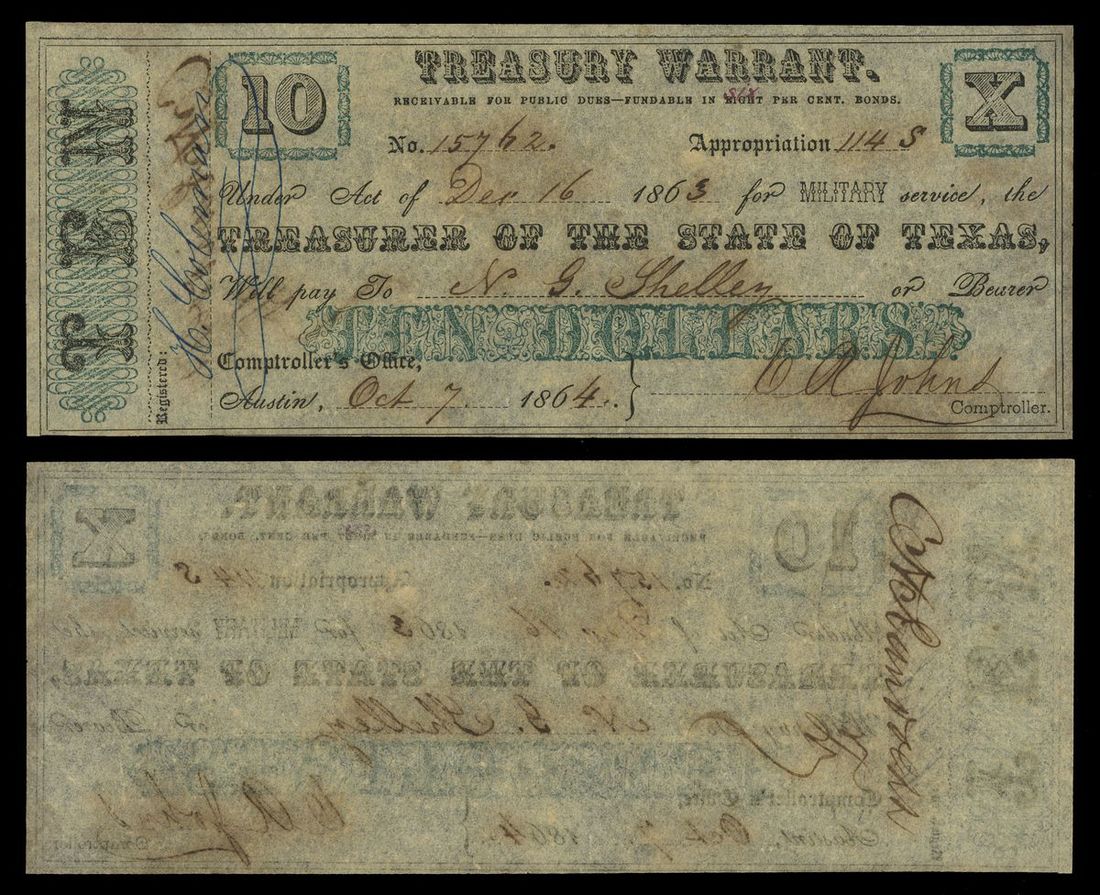 Texas. Treasury Warrant, $10, Act of 1863 (Oct 7, 1864). TW 19a. Military Service. No. 15762. Blue-green highlights. Paid to N.G. Shelley (Nathan George), CSA Brigadier General. Choice AU.