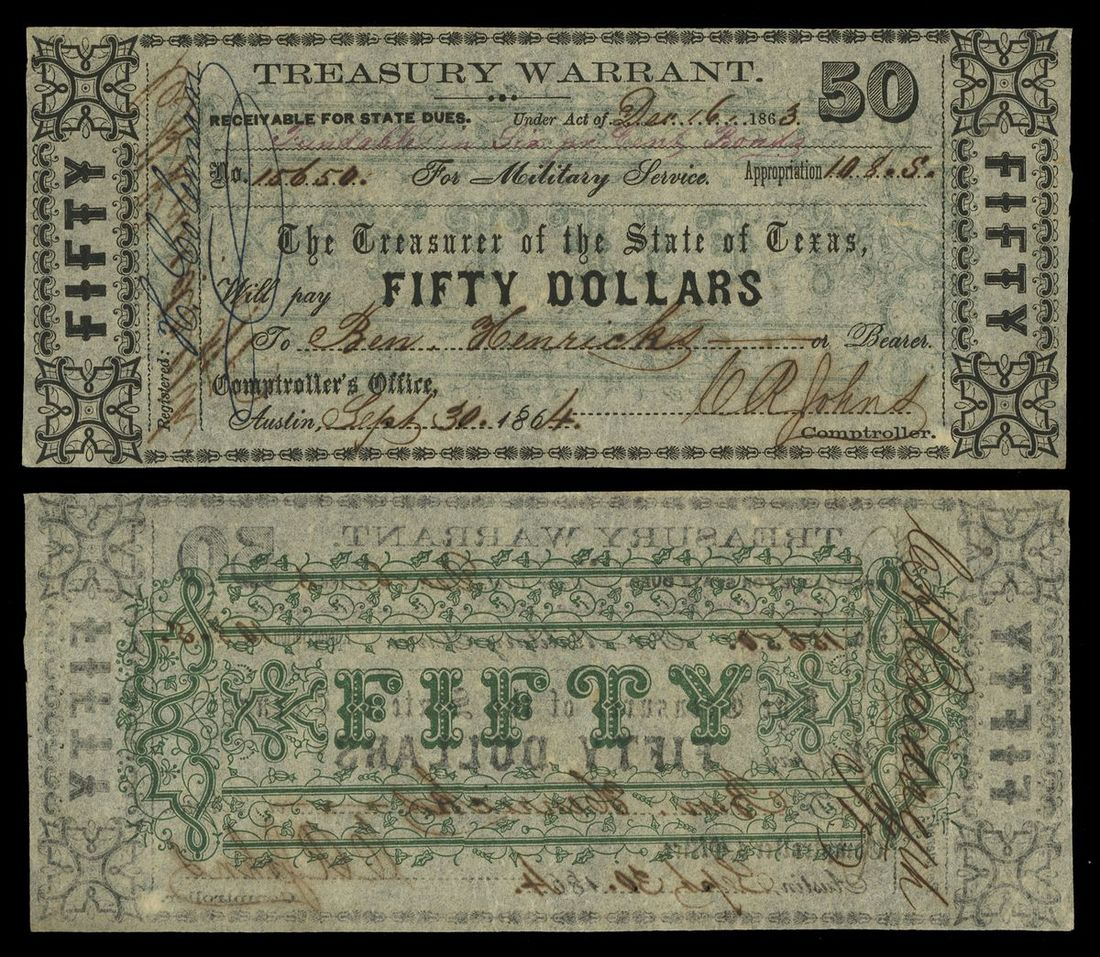 Texas. Treasury Warrant, $50, Act of 1863 (Sept. 30, 1864). TW 31A. Military Service. No. 15650. Embellished borders, fancy green back. Paid to Ben Henricks, Assistant Quartermaster General. AU.