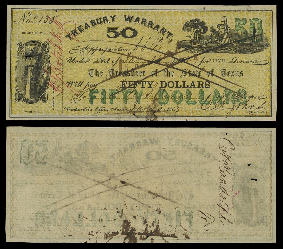 Texas. Treasury Warrant, $50 1863. Cr.30. Civil Service. No. 2135. Yellow and green; ships. Pen cancelled. A few spindle holes. About Uncirculated. Good color.