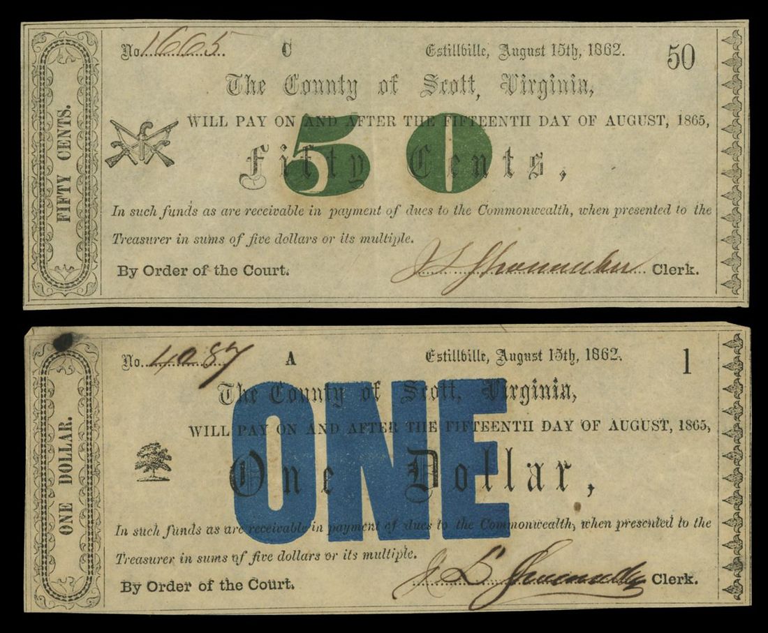 Virginia, A Pleasing Group of County of Scott, August 15, 1862 Scrip Notes. 50 Cents(2), $1(3). EF-AU. Must be seen, sold as is.