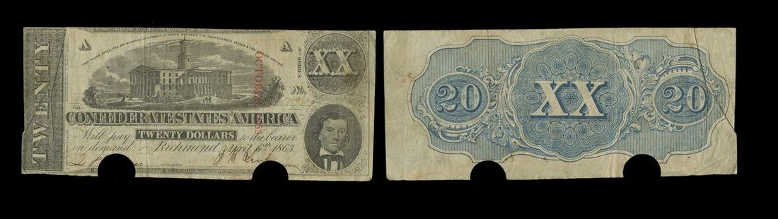 CSA. T-58. $20. April 6th, 1863, Very Fine. Punch cancelled on bottom. Soiling, October 1863 stamped in red on face.