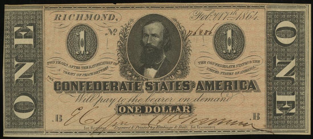 CSA. T-71. $1. Feb. 17, 1864. Cr.574. PF-12. No. 76286. B. Clement C. Clay at center. Tiny nick top edge. Nearly complete margins. Good Very Fine.
