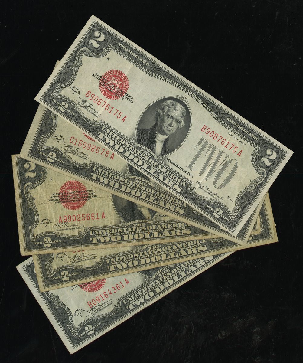 Quintet of 1928 $2 Legal Tender Notes. 1928 A. VG-Fine; 1928 C (2). Fine and VF; and Mule 1928 D (2). Reverse numbers: 239 and 267. Very Fine. [5]