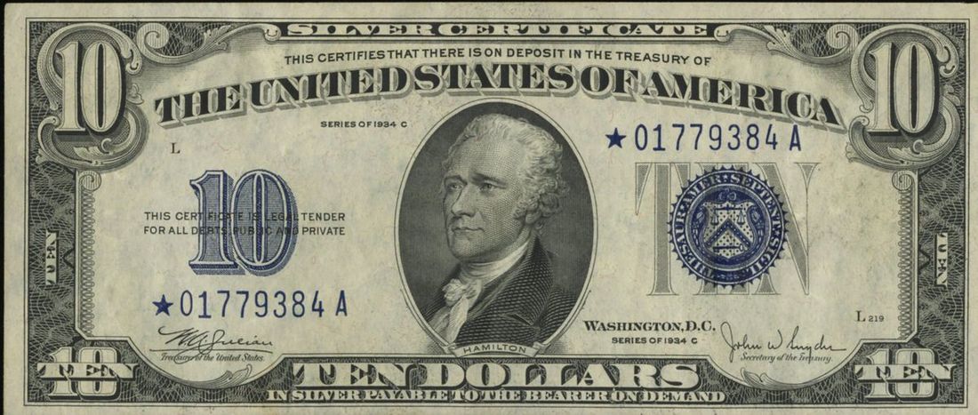 Fr.1704*. $10. Silver Certificate. 1934 C. EF-AU. Good snap.
