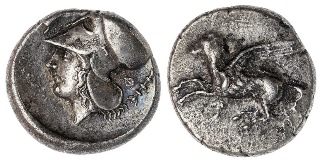 Corinth. AR Stater, ca. 400-375 BC. 8.0 gms. Pegasos flying left, rev. Helmeted head of Athena left, dolphin above, ivy leaf and thymiaterion behind. Ravel 843, HGC 4, 1832. Evidence of rusted dies. Very Fine.