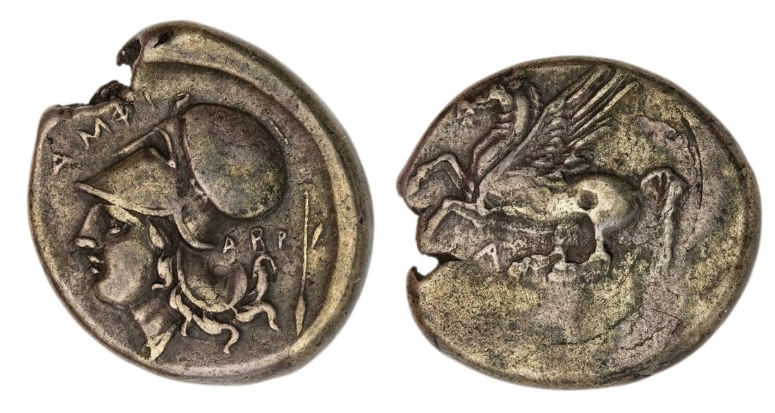 Akarnania. Argos Amphilochikon. AR Stater, ca. 340-300 BC. 8.24 gm. Pegasos flying left, A below, rev. Helmeted head of Athena left, AM?I above, ABP and javelin behind. SNG Copenhagen 315, HGC 4, 784. Irregular edge. Very Fine.