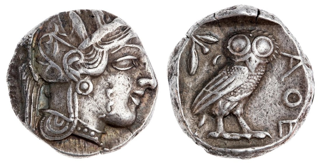 Athens. AR Tetradrachm, ca. 454-404 BC. 16.97 gm. Contemporary Eastern (likely Egyptian) imitation. Helmeted head of Athena right, three raised "chevrons" on cheek, rev. Owl standing right, head facing, olive sprig and crescent behind. Cf.Kroll 8 for prototype. Near Extremely Fine.