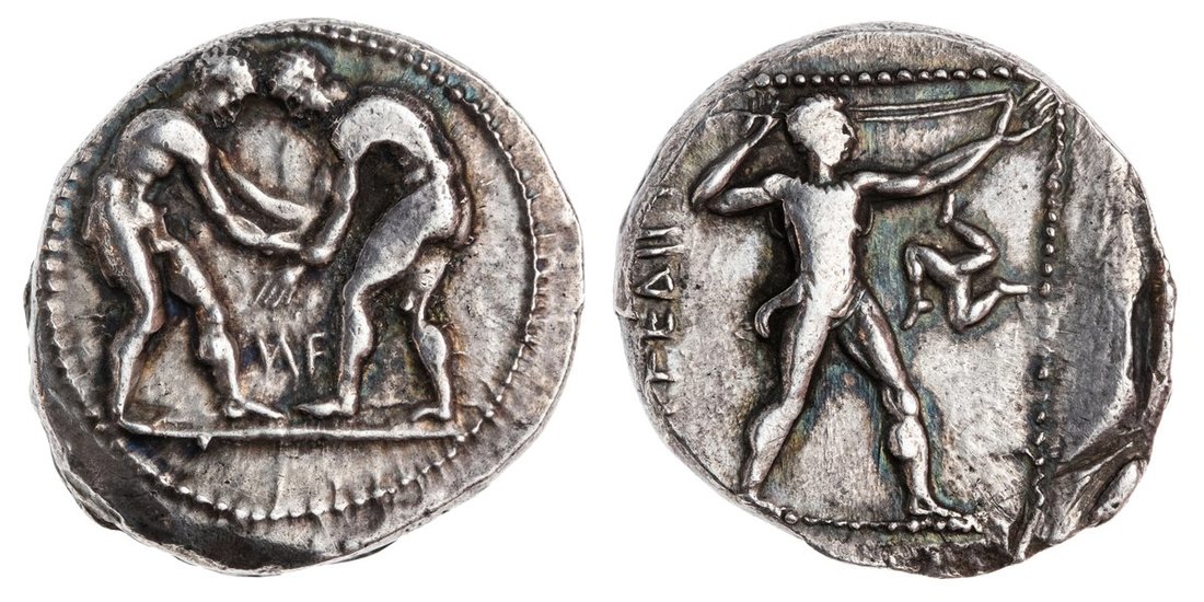 Pamphylia. Aspendos. AR Stater, 380/75-330/20 BC. 10.83 gms. Two wrestlers grappling, ?F between, rev. Slinger standing right, triskeles before. SNG France 101, SNG Copenhagen 101. Toned. Very Fine.