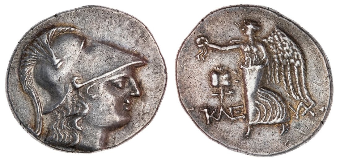 Pamphylia. Side. AR Tetradrachm, mid-First Century BC. Magistrate: Kleuch--. 16.12 gm. Helmeted head of Athena right, rev. Nike advancing left, holding wreath, pomegranate before, K?E-YX across. SNG France 696, SNG v. Aulock 4797. Near Extremely Fine.