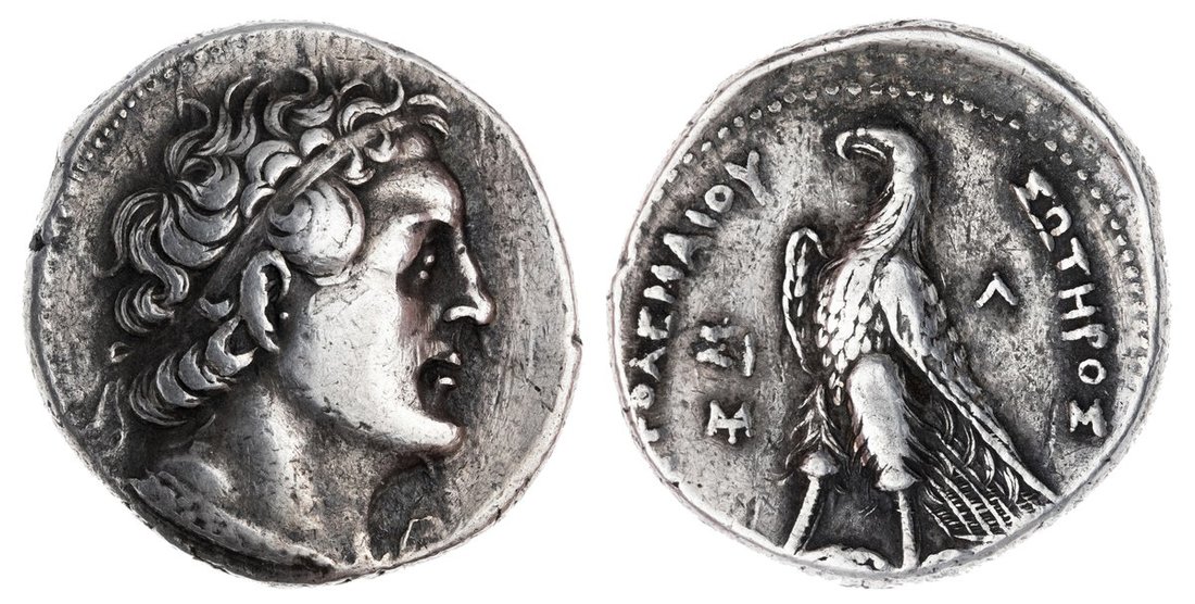 Kings of Egypt. Ptolemy II Philadelphos (285-246 BC). AR Tetradrachm. Sidon, dated regnal year 30 (256/5 BC). 14.06 gm. Diademed head of Ptolemy I right, wearing aegis, rev. Eagle standing left on thunderbolt, ?I and monogram before, date ? behind. Svoronos 732, SNG Copenhagen 511. Toned. Very Fine.