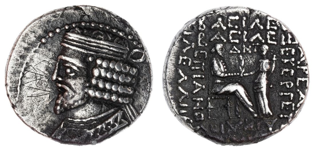 Parthian Hegemony. Vardanes I (ca. 38-46). AR Tetradrachm. Seleukeia on the Tigris, dated SE 354 (43). 14.44 gm. Diademed bust left, rev. Vardanes enthroned right receiving palm frond from Tyche, date ?NT above, month in ex. Sellwood 64.15. Toned over some graffiti in left obverse field. Very Fine.