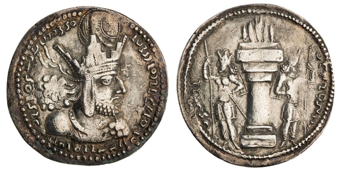 Sasanian Empire. Shahpur I (240-272). AR Drachm. 4.06 gm. Bust right wearing diadem and mural crown with korymbos and earflaps, rev. Fire altar with attendants. Minor deposits and slight graininess. Extremely Fine.