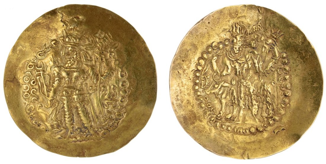 Hunnic. Kidarites. Temp. Yasada and Kirada (ca. 340-345). AV Dinara. 7.78 gm. In the name and types of the Kushano-Sasanian ruler Bahram. Bahram standing left on groundline sacrificing at altar and holding trident, trident standard at left above altar, middle prong surmounted by crescent, triple pellets below left arm, Kidarite tamgha lower right field, rev. Siva standing facing holding diadem and trident, Nandi the bull standing left behind. Cribb Kidarites 4A, ANS Kushan 2410, MK 719. Good Very Fine.