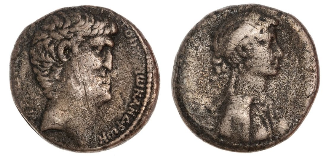 Roman Provincial. Mark Antony and Cleopatra VII of Egypt. AR Tetradrachm of Antioch, Seleucis and Pieria, 36 BC. 14.83 gm. Diademed and draped bust of Cleopatra right, rev. Bare head of Antony right. Prieur 27, RPC 4094. Toned over some roughness and a few old scratches and marks. Antony profile double struck. Fine.