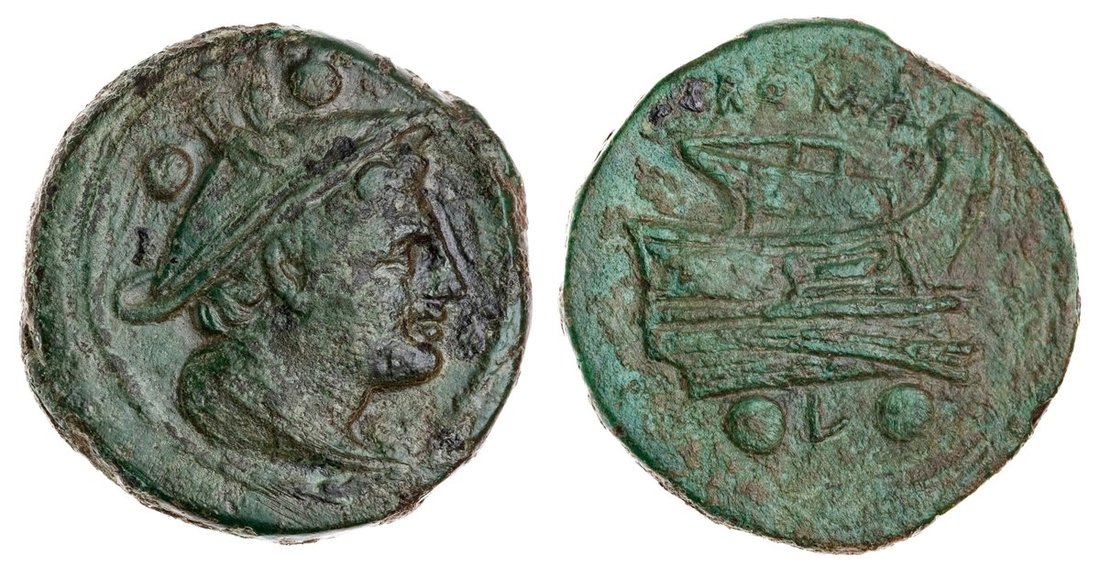 Roman Republic. Anonymous (214-212 BC). AE Sextans. Luceria mint. 12.1 gm. Draped bust of Mercury right wearing petasos, two pellets above,