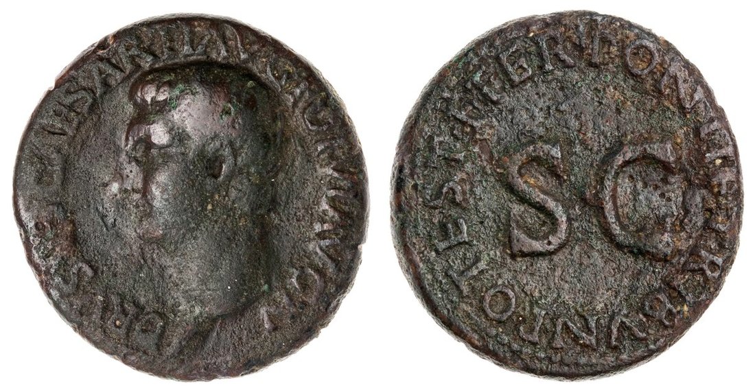 Roman Imperial. Drusus (died 23). AE As. Rome mint, struck under Tiberius, 22-23. 10.9 gms. Bare head left, rev. Legend around large SC. RIC (Tiberius) 45. Deep olive-green. Fine.